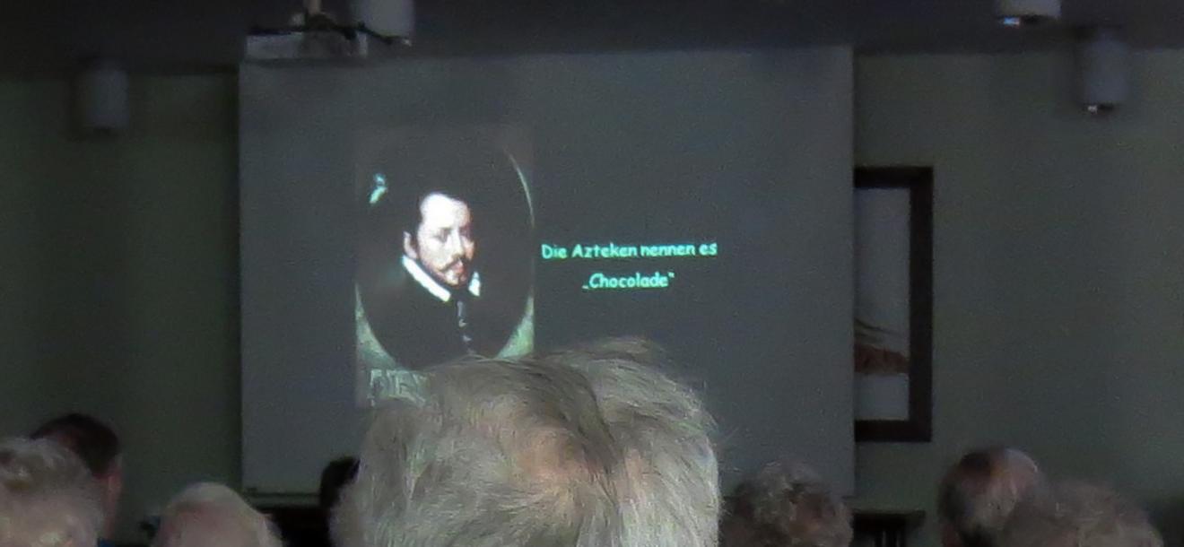 Herr Clauß nahm uns mit auf die Reise der Kakaobohne. Sehr anschaulich führte er die Bewohner mit vielen Bildern und Musik zu Besuch bei den Azteken und Marco Polo, durch die USA und China und zum Panzerkreuzer Potemkin. Diese Tour endete im Schokoladenmarkt in Dresden zusammen mit dem Schokoladenmädchen und der Hallorenkugel aus Halle.