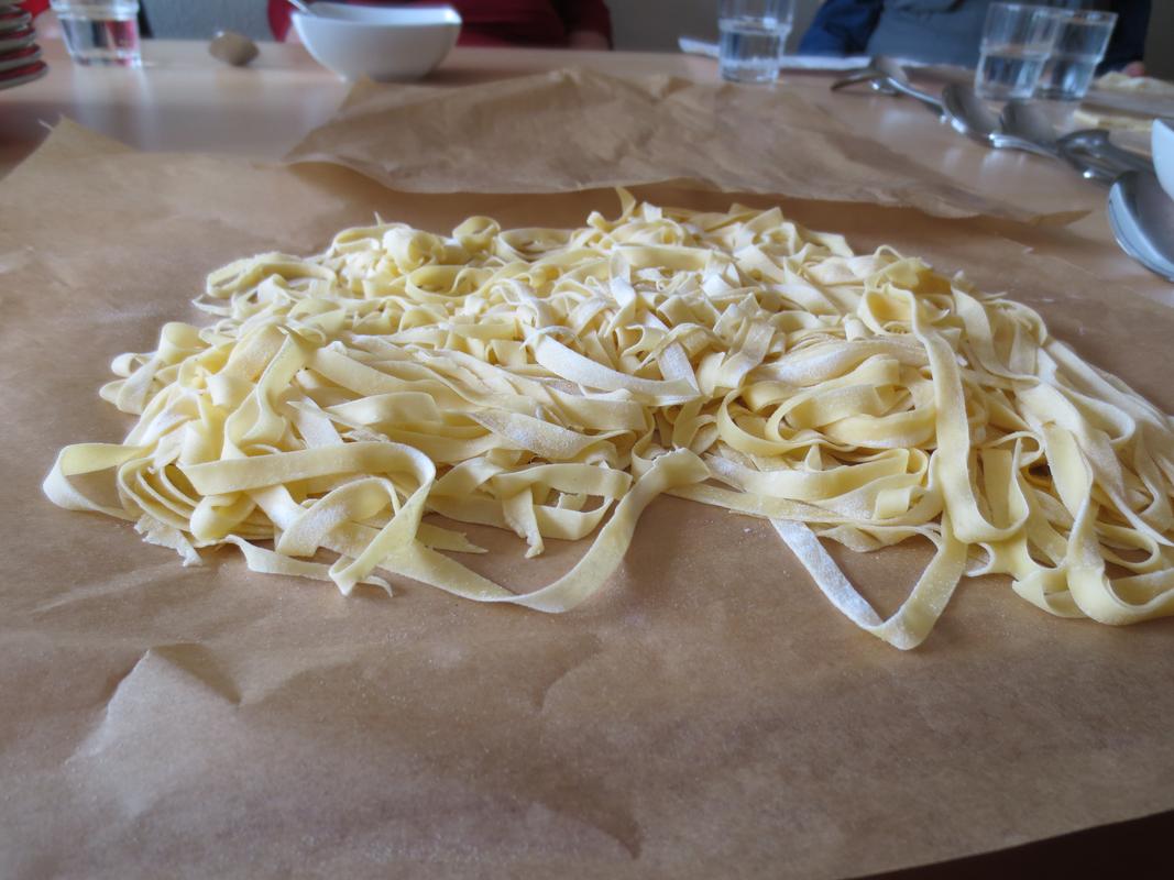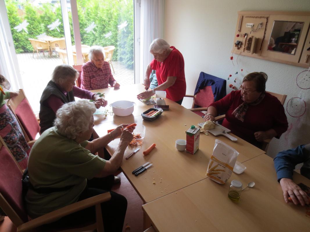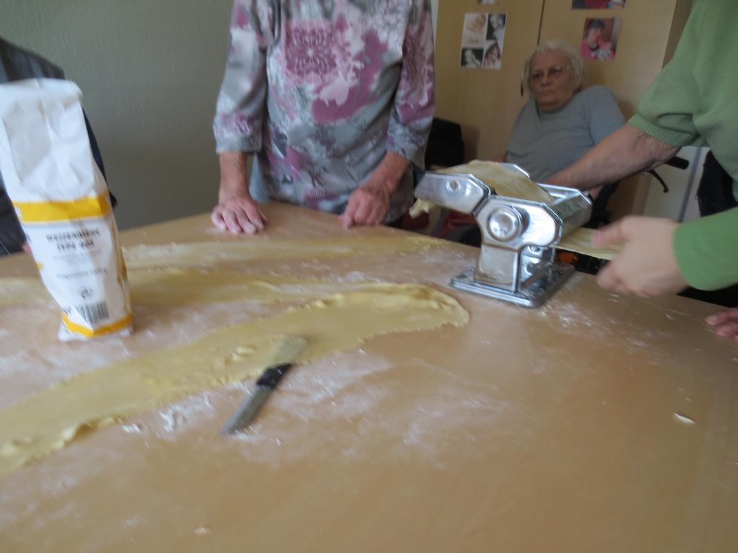 Nudeleintopf stand am Mittwoch auf dem Plan der Ergotherapie. Klingt einfach, hat es aber in sich! Es sollte weder Instantsuppe noch gekaufte Nudeln aus der Tüte verwendet werden. Also so wie früher: Hühnchen auskochen, Teig kneten, Nudelmaschine betätigen. Diese Mahlzeit führte uns wieder einmal vor Augen, wie einfach wir uns das Kochen oft machen. Erfahrungen wurden ausgetauscht und zum Schluss waren sich alle einig: Selber gemacht schmeckt doch anders … besser eben!